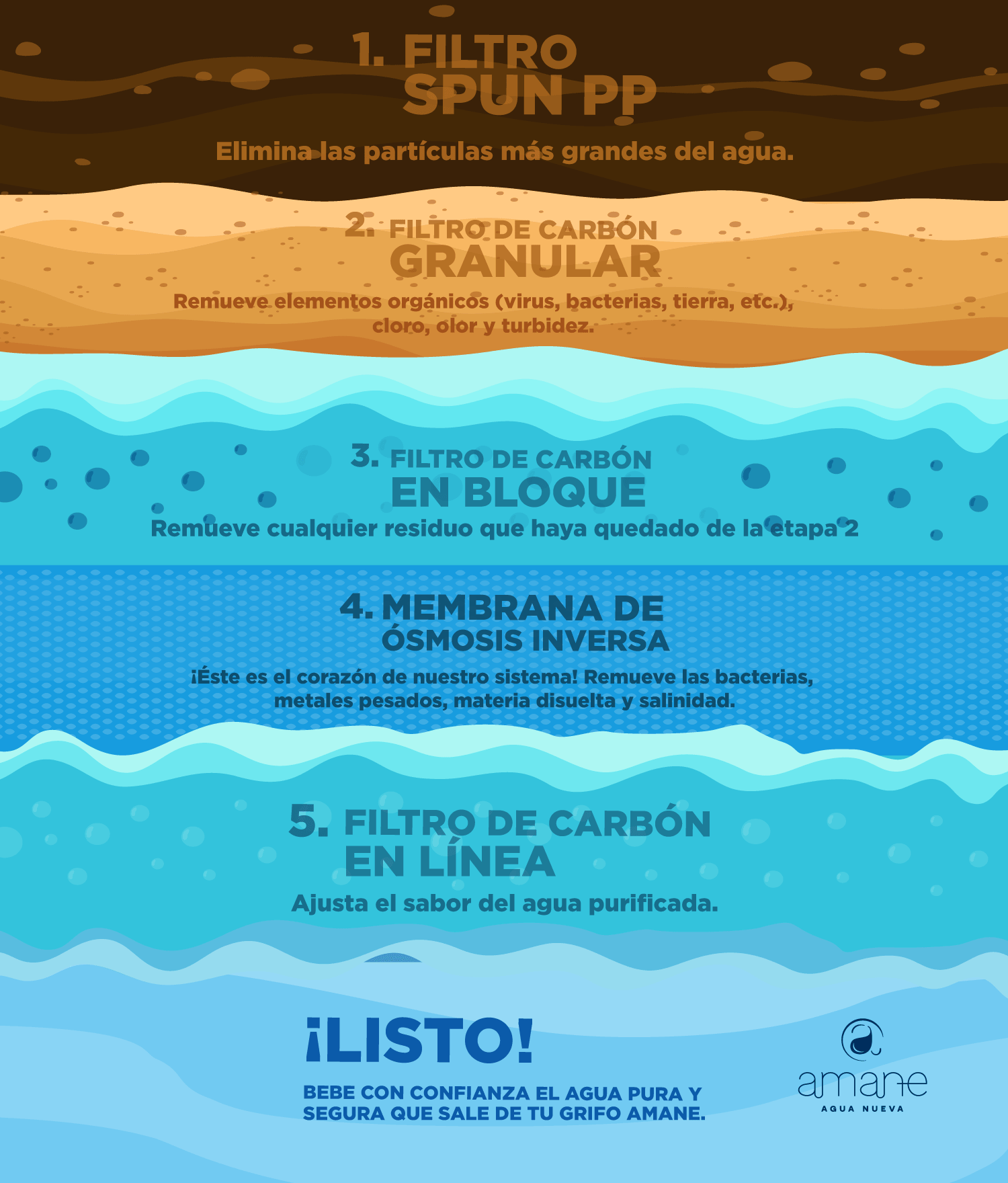 La ósmosis inversa es un proceso de purificación de agua de tecnología avanzada que realiza una purificación a través de 4 filtros y una membrana que remueve materia orgánica y contaminantes del agua para hacerla pura.